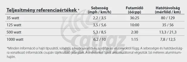 A Spirit EVO motorok nagyobb akkumulátor teljesítménnyel rendelkeznek (1276 Wh), hogy még több időt tudjunk a vízen tölteni. Tolóereje egy 3 lóerős benzines csónakmotoréhoz hasonló. A lítium-polimer akkumulátor egy töltéssel kétszer olyan hosszú menetidőt kínál, mint más elektromos motorok. A motor nagyon csendes, zajkibocsátása legfeljebb 60 dB.